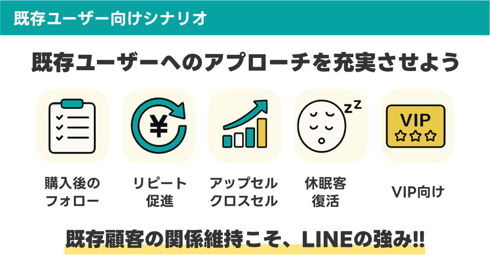 既存顧客向けの施策は新規獲得に比べて費用対効果が高く、LTV(顧客生涯価値)の向上に直結するので、ぜひ力を入れていきましょう。