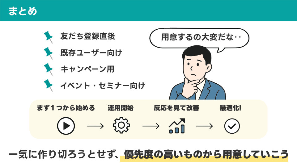 最初はすべてを完璧に作ろうとせず、自社のビジネスで最も重要だと思われる1つのパターンから始めることをおすすめします。例えば、新規客獲得が急務なら「友だち登録直後シナリオ」から、既存客のリピート率向上が課題なら「既存ユーザー向けシナリオ」から取り組むとよいでしょう。