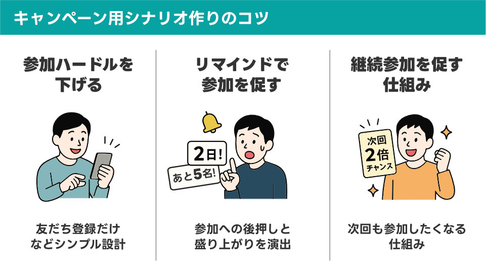 一度参加してくれたユーザーに「次回も参加したい」と思ってもらえるような仕組みを作ります。例えば「今回落選の方は次回キャンペーンで当選確率2倍」「毎月開催するので継続参加でプレミアム特典」など、単発で終わらせない工夫が重要です。