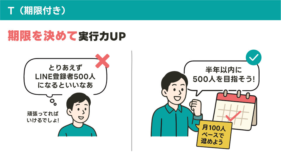 良い例: 「半年以内にLINE登録者数を500人にする」