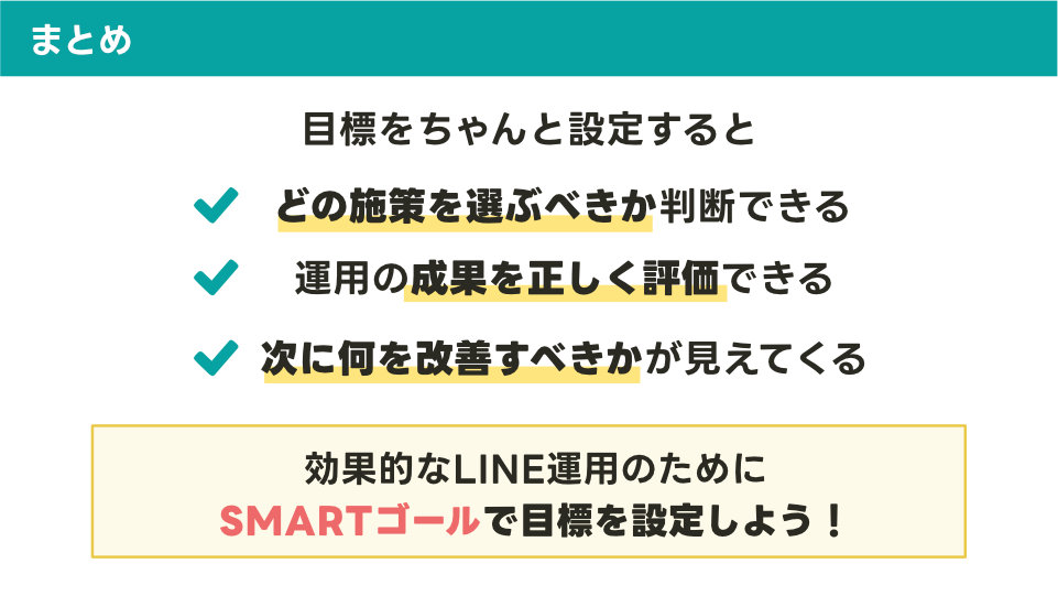 目標は、できるだけ具体的に設定しましょう。「LINEを活用したい」という曖昧な目標ではなく、何をどれだけ達成したいのかを明確にします。